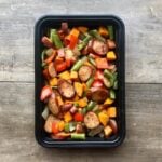 Chicken sausage, sweet potatoes, onions, peppers, and green beans roasted together for a quick and easy meal prep dish. This meal is packed with flavor from the sausage and is an easy way to get a big serving of vegetables.