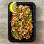 These Crispy Chili Beef Noodles are made of crispy ground beef, noodles, a medley of vegetables, and a sauce flavored with gochujang. It only took me 35 minutes to prep 5 of these for my week.